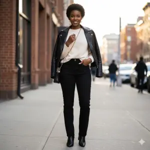 The high waist makes your legs look longer and works well with tucked-in tops. Straight legs balance your proportions and look modern without being too trendy.